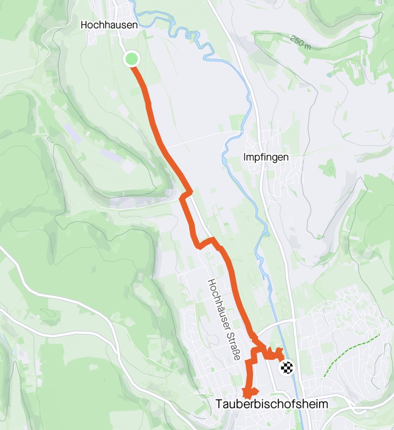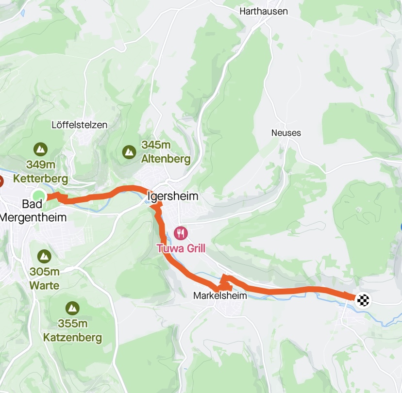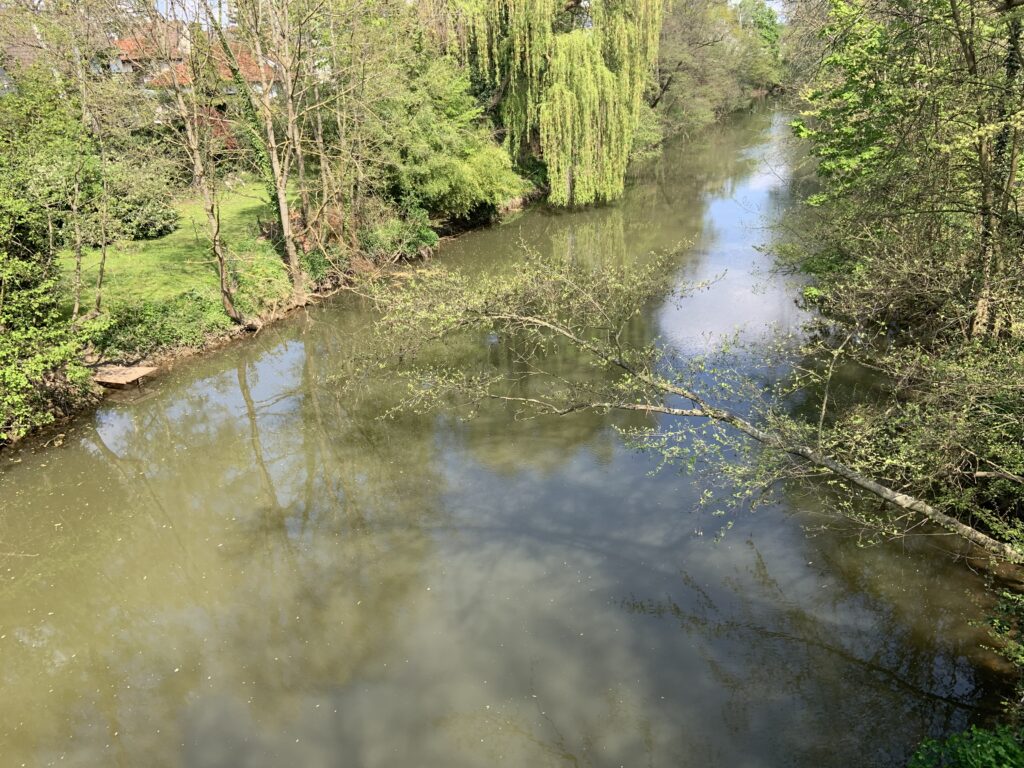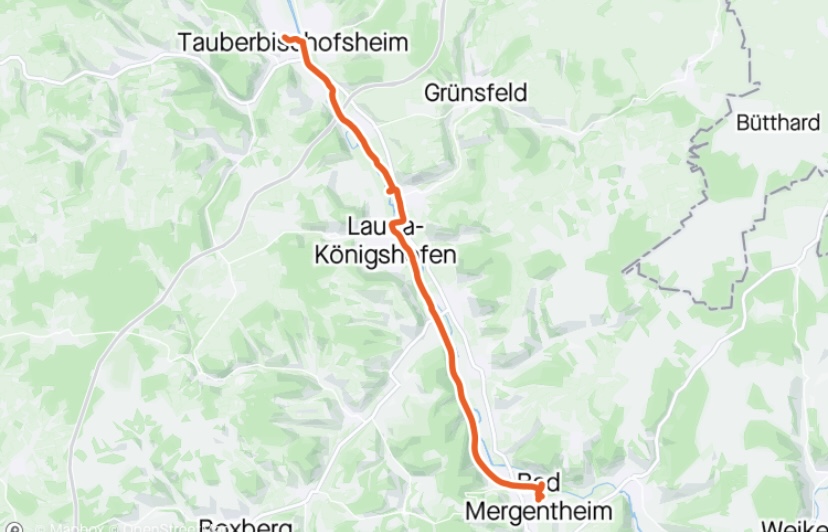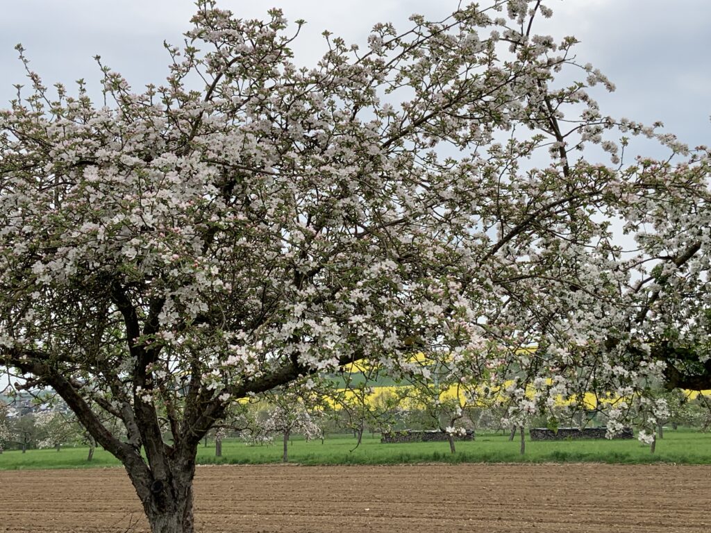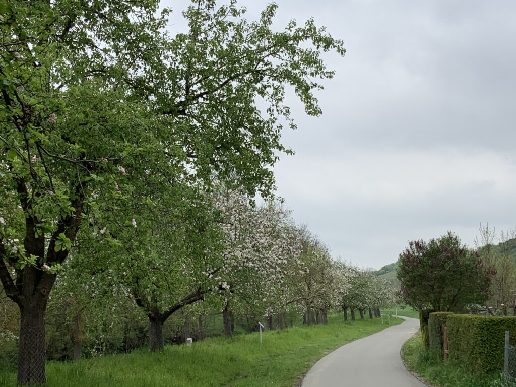 In Bad Mergentheim müde am Morgen los. An der Tauber bei strahlendem Sonnenschein vorbei an wunderschön blühenden Apfelbäumen.