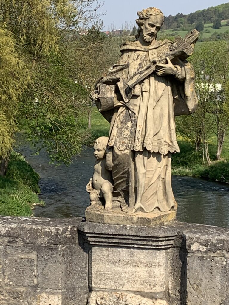 Jede noch so kleine oder große Brücke wird von Heiligen behütet, sehr warscheinlich gilt es auch den Reisenden, also auch mir, ob ich will oder nicht. Heute ist aber nach knappen 11km die Luft raus, ich muß noch bis Satteldorf, erst dort wieder einen freien bezahlbaren Schlafplatz gefunden. Also ab in den Zug, Nahverkehr funktioniert hier an der Strecke ganz gut…. Bis jetzt auf jeden fall. Heute musste ich allerdings hielt der Zug zwar in Satteldorf, jedoch konnte man wegen Umbauarbeiten am Bahnhof nicht aussteigen und so ging die Fahrt weiter bis Crailsheim. Blöd gelaufen.. also Bus suchen der nach Satteldorf fährt. Gesucht gefunden und der Busfahrer war so lieb und ließ mich ohne Ticket mitfahren und erklärte mir dann auch noch den restlichen kurzen Fußweg. Schon Nett die Leute hier. Im Gästehaus Krauß wurde ich lieb empfangen und der Weg zur nächsten Dorfschänke erklärt, die hätt ich nie gefunden und erkannt… Uraltes Fachwerkhaus und der Schankraum im ersten Stock, es gab Sauerkraut, Brot und zwei Bratwürstchen. Ach ja, Bier natürlich auch. Aber wie ne Kneipe sah es wirklich nicht aus. Abends dann noch alleine im vollgestopften Garten gesessen und die letzte Zigarette vorm schlafen gehen geraucht.